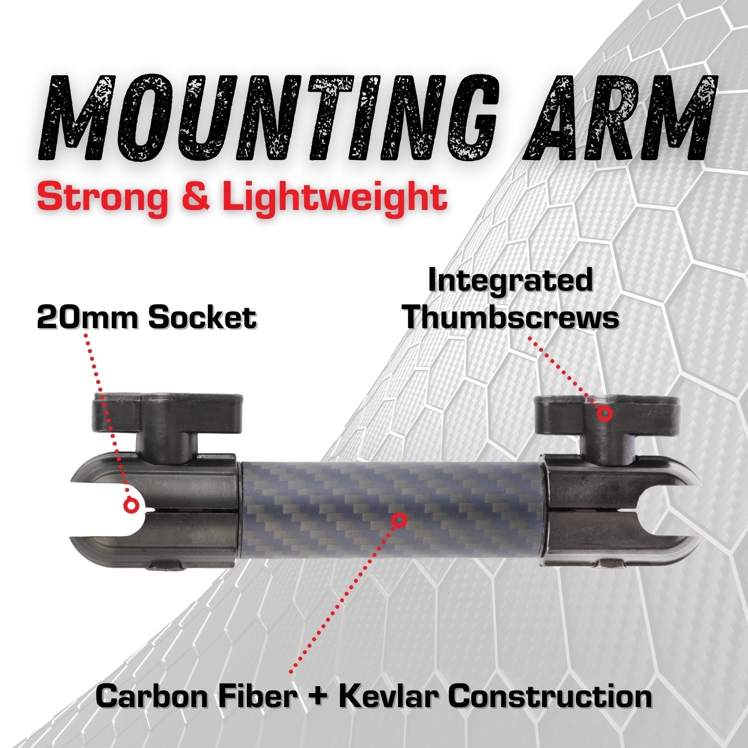 Also included is one of our Strong & Lightweight 7cm Carbon Fiber and Kevlar Mounting Arms.