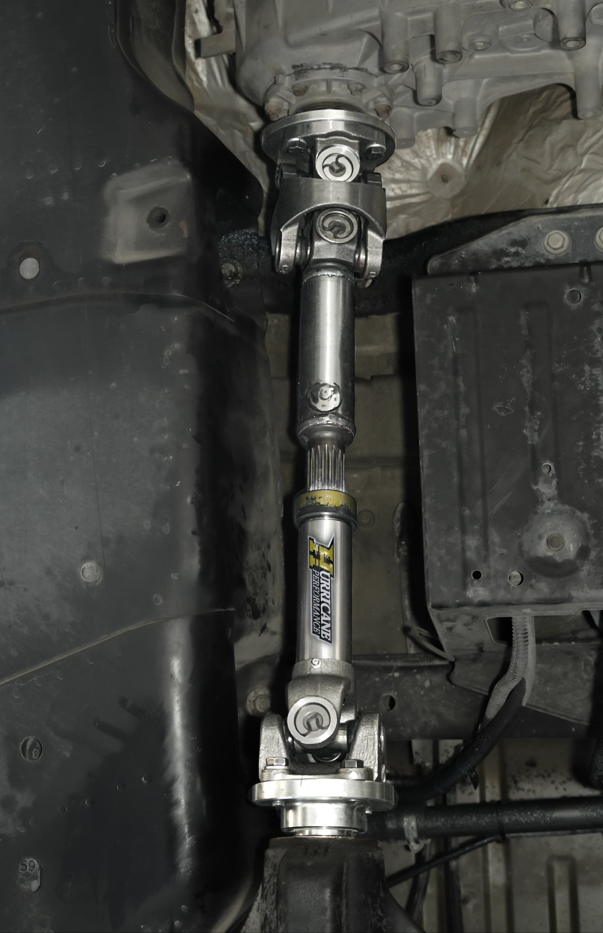 The double cardan joint drive in Hurricane Performance's Heavy Duty Rear Driveshaft for the Jeep Wrangler JK - 2 Door provides maximum strength and improved operation angle compared to other driveshafts. With upgraded tube thickness and standard slip yokes, this driveshaft guarantees easy installation and long-lasting durability. The direct bolt-on method eliminates the need for modifications or drilling, making installation a breeze.