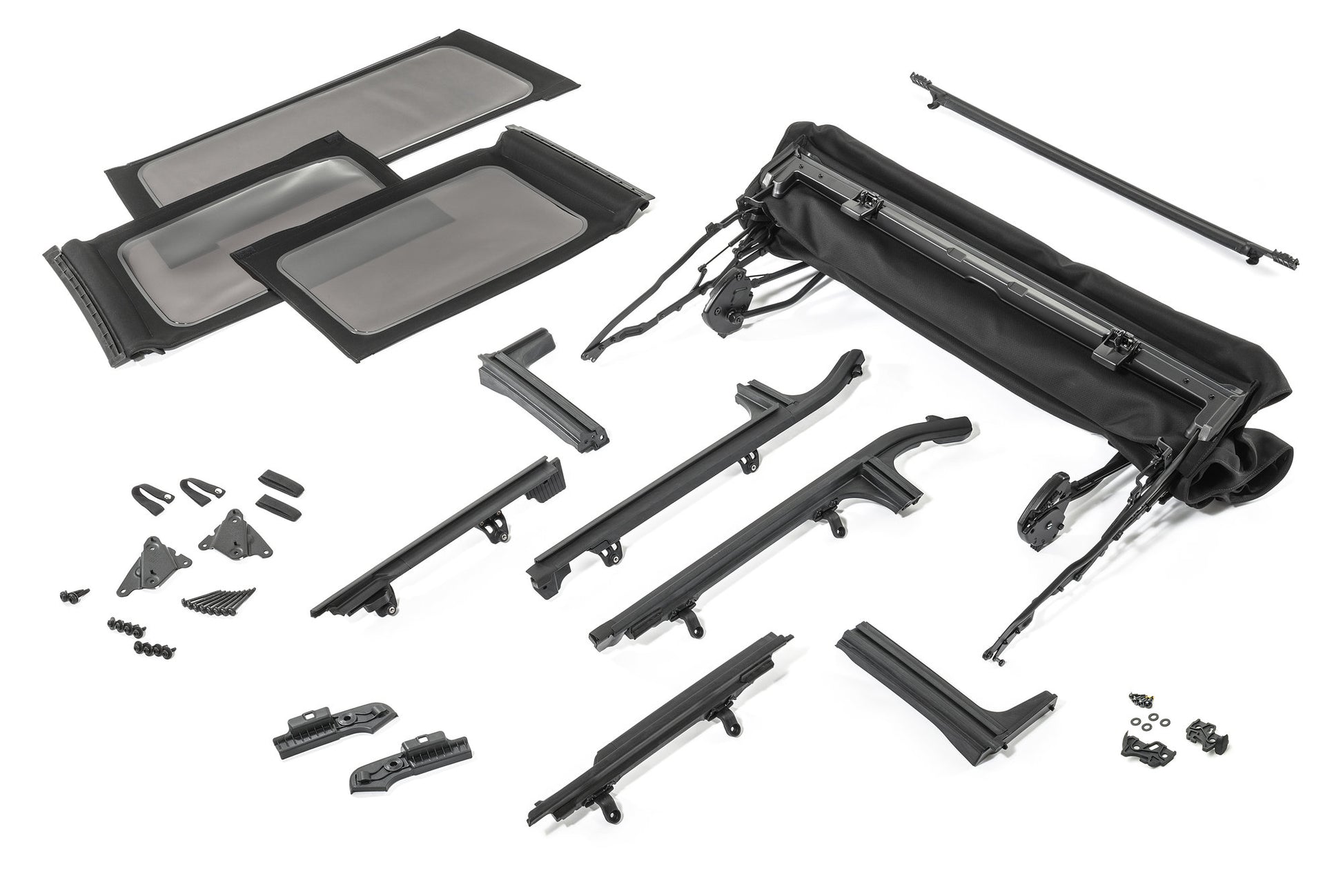 This brand new Mopar Twill Soft Top Kit is unlike anything you’ve ever seen on a Wrangler. Why? Well, not only does this kit give you everything necessary to make the transformation from hard top to soft top on a Wrangler Unlimited JL, but it offers an upgraded Sunrider feature - making it effortless to detach and open the front section thanks to a new gas strut-assisted mechanism. Then, once the top is flipped back into that Sunrider spot, a lone rear latch will release the hardware when pulled, allowing the top to simply slide up or down on rails almost automatically. This means no more struggling with bulky hardware, or racing against nature to get that top back into place. The Mopar Twill Soft Top Kit also features three rear 40-mil thick windows that glide in and out using a zipper-less C-channel attachment. Even better, the windows can be removed while the top stays in place, leaving you with a full length safari style bikini top for the ultimate in open air feel. This revolutionary top is designed to work perfectly with the factory full steel doors to make a complete seal from the elements, and the thick black twill material is extremely weather tight, durable and quiet.