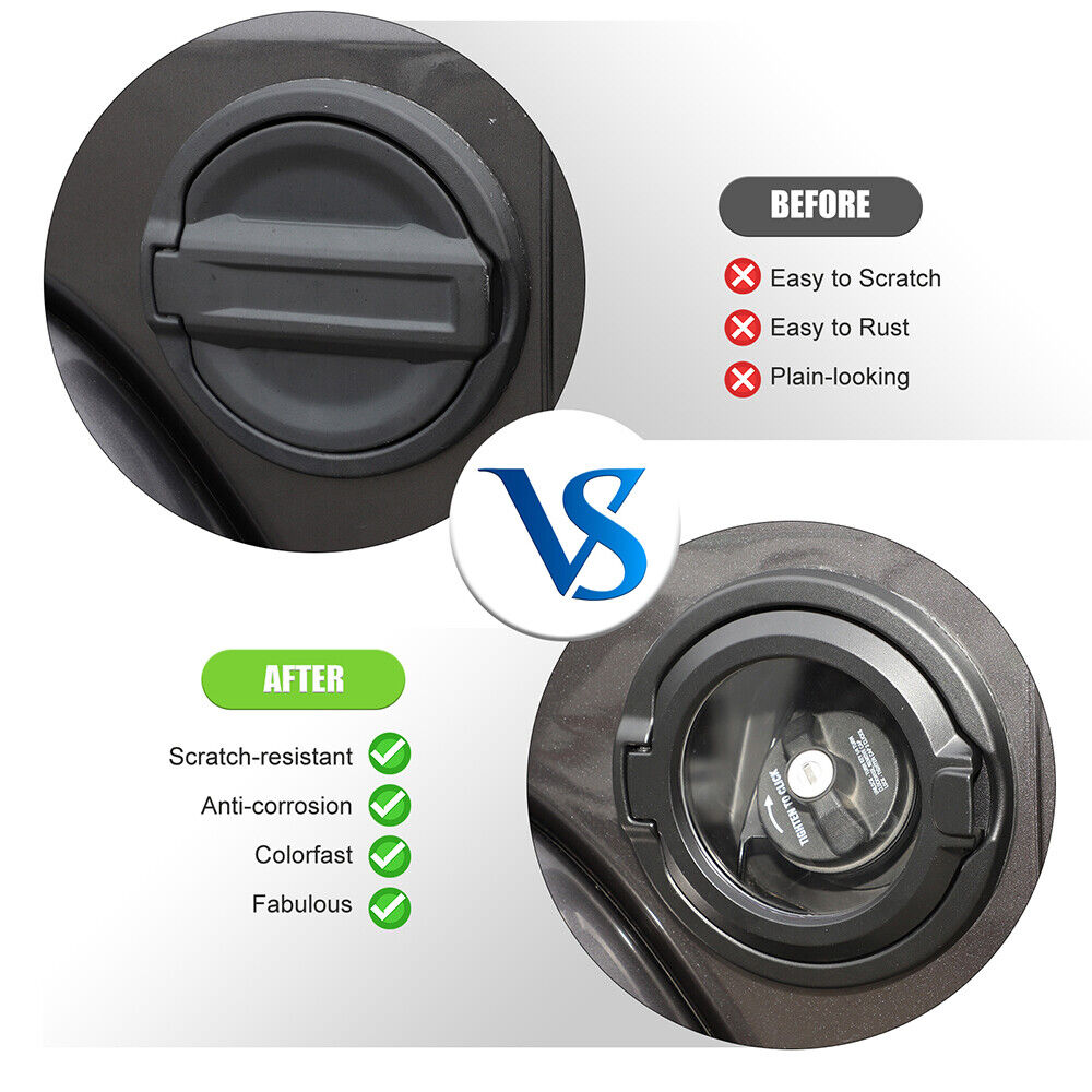 - EASY INSTALLATION: Easy to install, no drilling and cutting required for this jlu gas cap cover, non-Locking, finger notch opening.