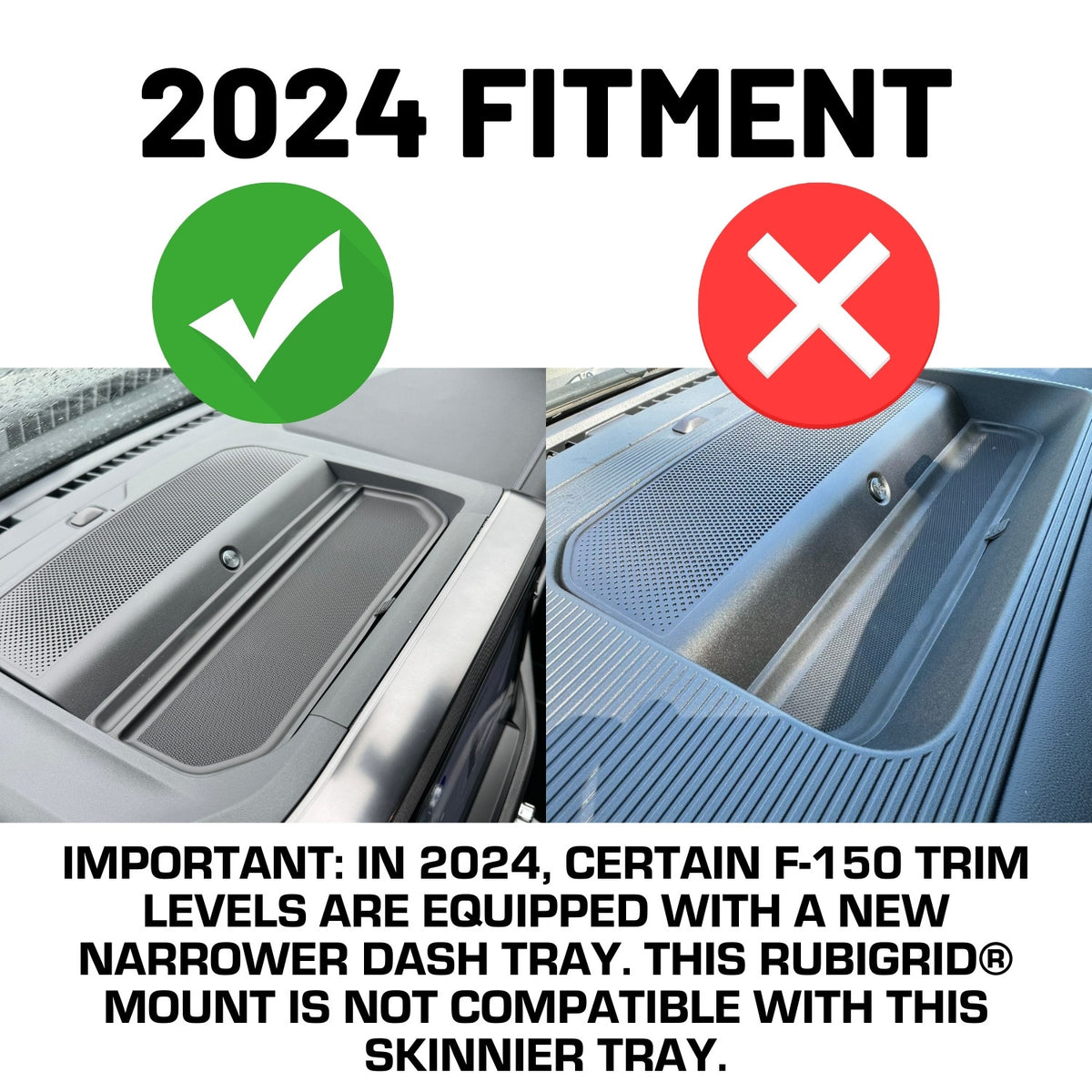 ⚠️ IMPORTANT 2024+ FITMENT: Ford offered 2 different styles of dash trays depending on your Model and Equipment Group. Please refer to the Vehicle Fitment section to make sure your vehicle is compatible with this RubiGrid® dash mount.