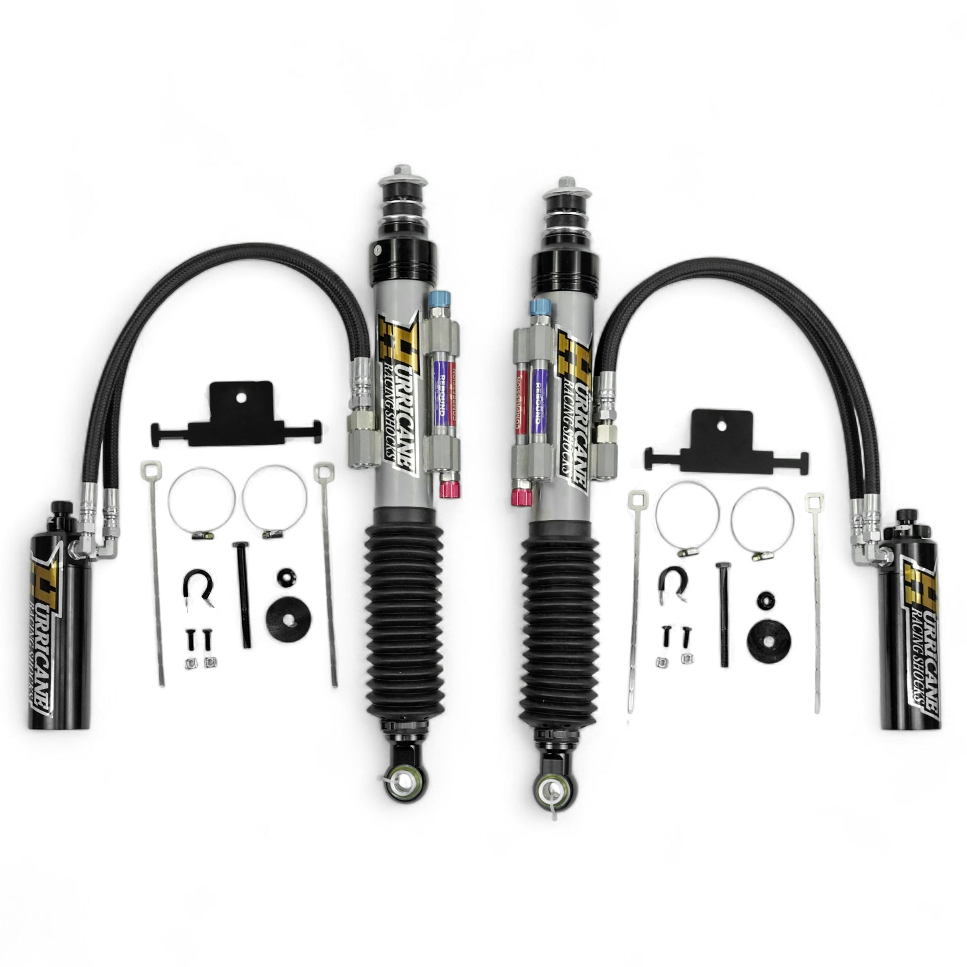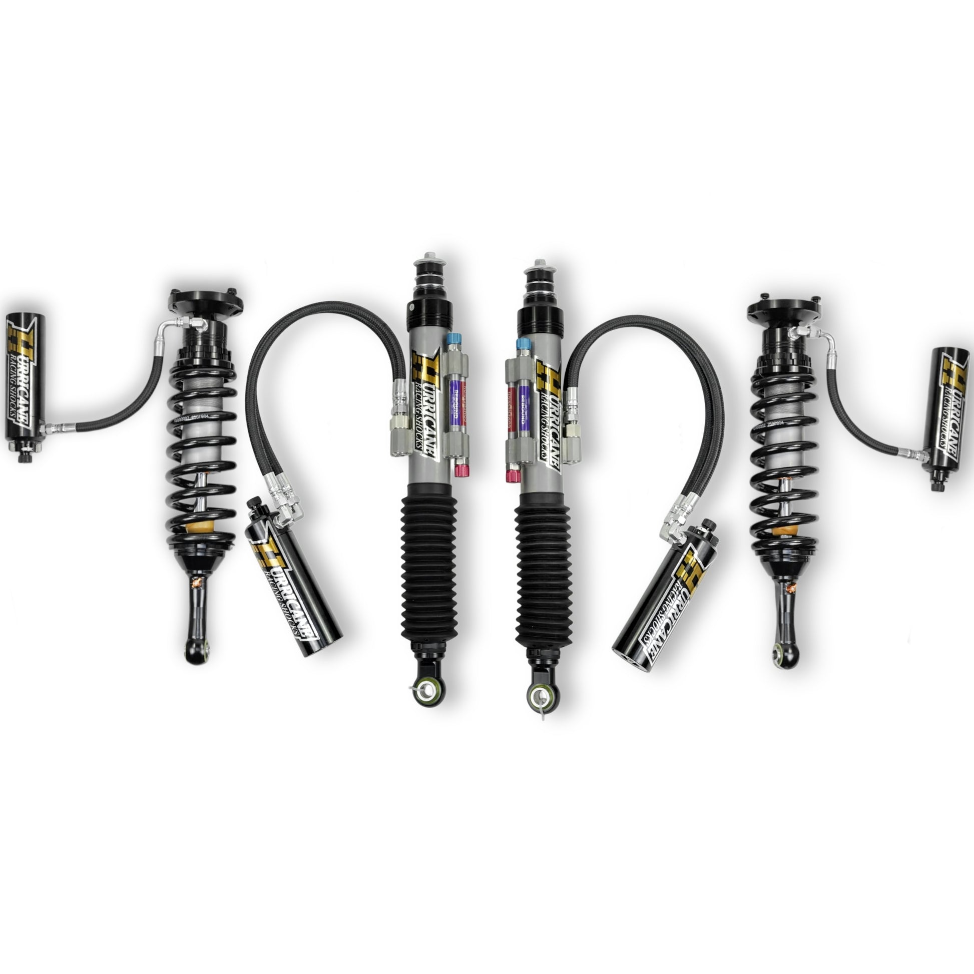 HURRICANE RACING EXTREME SERIES 2.5 DUEL COMPRESSION ADJUST & SINGLE REBOUND ADJUST FRONT COIL-OVER SHOCKS & 2.5 REAR EXTERNAL DUEL BYPASS SHOCKS ( 1-2 " Lift) FOR FJ CRUISER PRADO, 4RUNNER AND FORTUNER