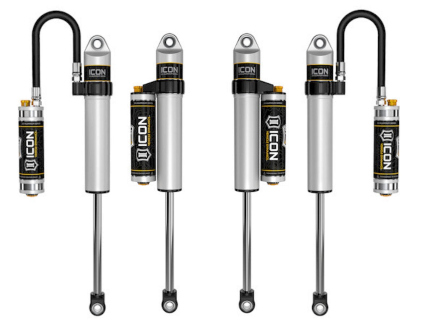ICON Vehicle Specific (V.S.) 2.5 Series shocks are designed and built to give your vehicle outstanding performance off-road and a smooth ride on the street. These shocks are configured specifically for each application in both length and damping tune. Like all ICON'S Shock Absorbers, V.S. 2.5 Series shocks are 100% rebuildable and 100% re-valveable. For piggyback and specific remote reservoir applications, ICON'S unique use of a 6061 billet aluminum manifold a few inches below the top cap of the shock creates an internal Bump Zone that when used creates an additional 20% of damping force. This additional force helps prevent harsh bottom outs and controls the suspension when compressing at high velocity. The ICON CDC Valve is an externally adjustable valve that restricts oil flow into the reservoir which creates 10 levels of compression damping force ranges. Shin guards are also included with this application to help protect the shock shafts from debris strikes during off-road use.