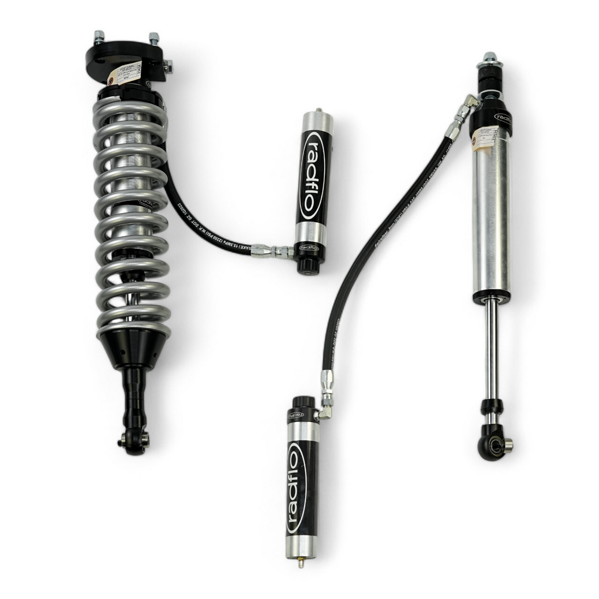 RADFLO OE REPLACEMENT 2.5 FRONT COILOVER KIT AND 2.5 REAR SHOCKS WITH REMOTE RESERVOIR AND COMPRESSION ADJUSTER EXTENDED FOR TOYOTA LANDCRUISER 200 SERIES 2007+ USE WITH AFTERMARKET UCA