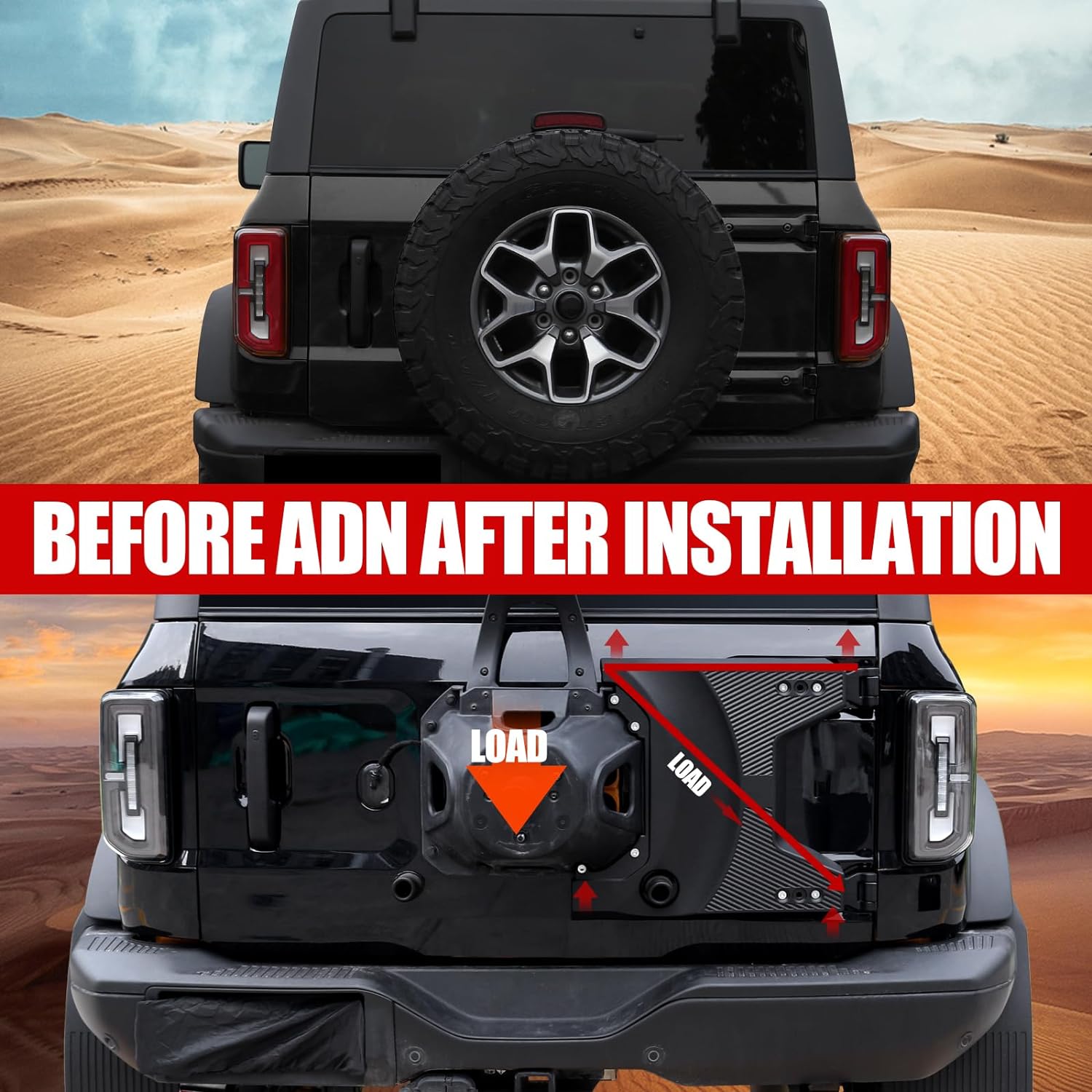 - Enhance Load-bearing: By upgrading the hinges, the tailgate reinforcement allows for the support of larger and heavier tires, effectively alleviating tailgate sagging issues and preventing the tailgate from rattling, warping, or getting dented.